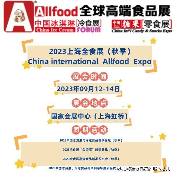 1.展會基本信息 時間:2023年9月12-14日 地點:國家會展中心(上海)展館(上海市青浦區(qū)崧澤大道333號) 展館:1.1、2.1號館 預(yù)計展會規(guī)模:8萬平方米,約1200家展商 預(yù)計觀眾:120000人次 展位申請:18601736437 蔣先生 上海,作為一個全球化大都市,美食文化自然也是十分豐富多彩。而在這個美食的天堂,Allfood2023上海全食展無疑是一個讓人垂涎欲滴的盛宴。