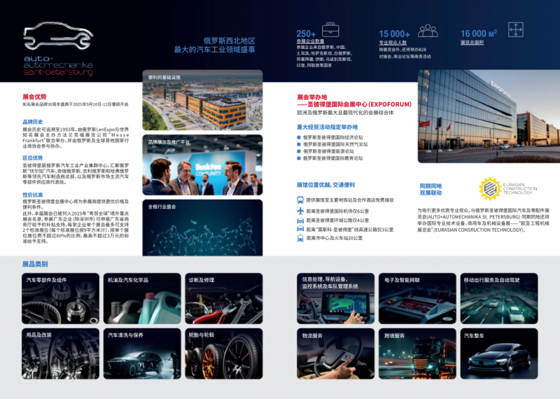 展會(huì)舉辦地俄羅斯圣彼得堡是俄羅斯最大的經(jīng)濟(jì)中心之一,具有獨(dú)特的地理位置優(yōu)勢(shì),是波羅的海沿岸重要交通樞紐和港口,具有顯著的經(jīng)貿(mào)優(yōu)勢(shì)。圣彼得堡也是俄羅斯四大工業(yè)區(qū)之一,聚集大量汽車(chē)制造企業(yè),在當(dāng)前背景下,對(duì)中國(guó)進(jìn)口的汽車(chē)相關(guān)需求及潛力巨大,也是中國(guó)企業(yè)赴俄考察、了解市場(chǎng)及競(jìng)品的重要窗口。