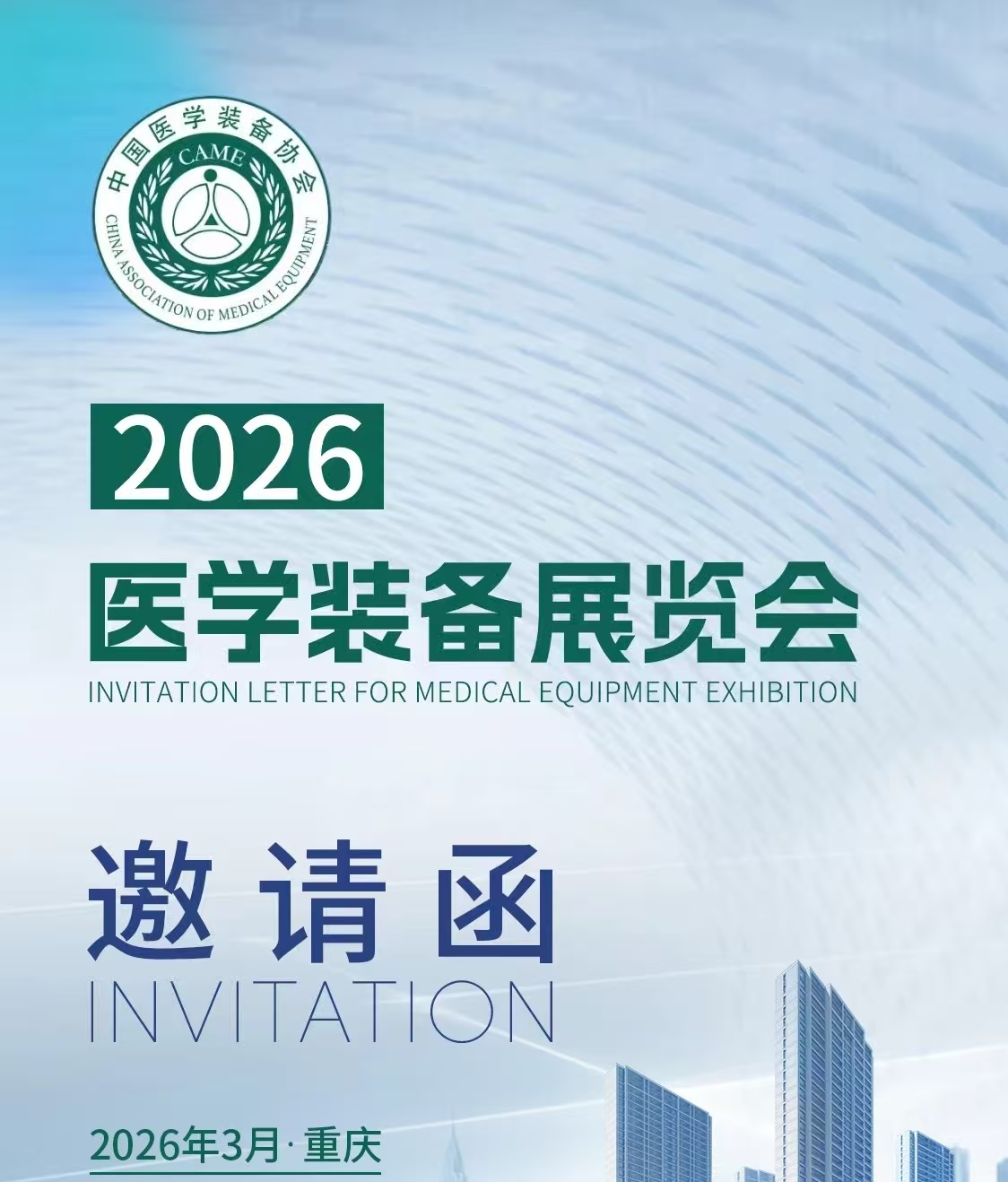 2026年第35屆中國醫學裝備大會暨2026醫學裝備展覽會將于2026年3月26日至29日在重慶國際博覽中心舉辦,展會由中國醫學裝備協會主辦,是醫學裝備領域的重要行業盛會。